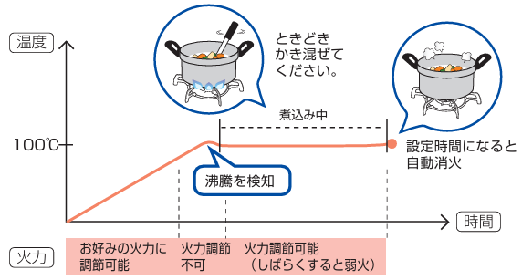 さらに、温度が下がった場合は火力を調節し、100℃前後の温度を持続してくれます。