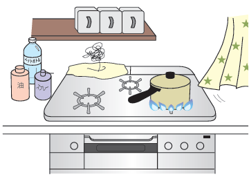ガスコンロの上や周囲には、可燃物や引火物を置いたり、近付けてはいけません。