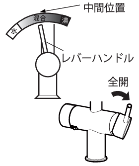 ④レバーハンドルを湯と水の中間位置にして全開にする。