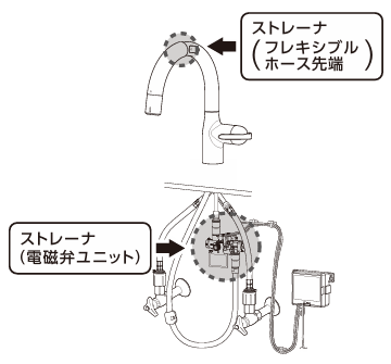 ストレ―ナ2か所(フレキシブルホース、先端および電磁弁ユニット)は、ゴミなどで目詰まりを起こすことがあります。