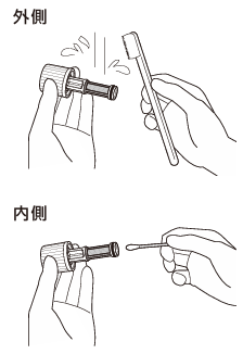 ④水抜き栓のストレーナ部分の汚れを外側は歯ブラシなど、内側は綿棒や細いブラシでこすり洗いをして取り除く。