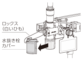 ②電磁弁ユニットの水抜き栓カバーを矢印の方向に引き抜く。