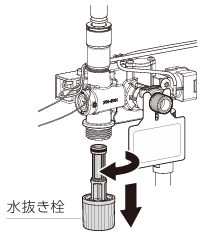 ③電磁弁ユニットの水抜き栓を左に回し取りはずす。