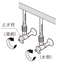 レバーハンドルを水側全開および湯側全開にしたときの吐水量が最適となるように、水側・湯側の2つの止水栓を調節してください。