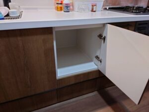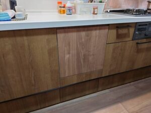 浅型食洗機を撤去し背面加工と給排水の処理をし、扉を取り付けるお見積りをさせていただきました。扉は既存キッチンとお色は異なります。アイカ工業のサンプルをお送りさせていただき、TNY 10199K色にて決定いただきました。