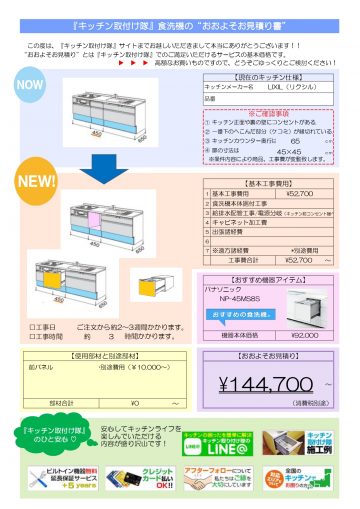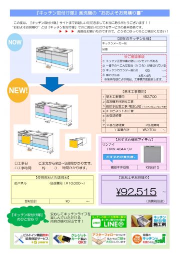 買い換え,交換,取り替え,リフォーム,ビルトイン,食洗機交換工事,取り付け,システムキッチン,リンナイ,スライドオープン,パネル面材