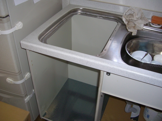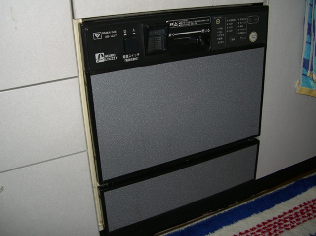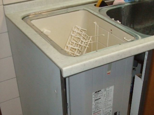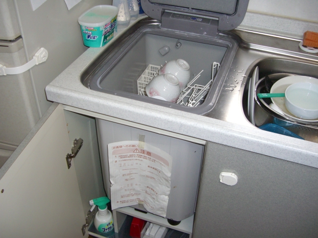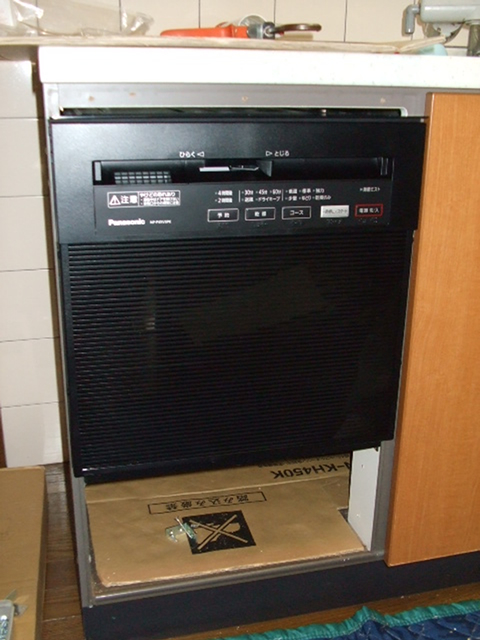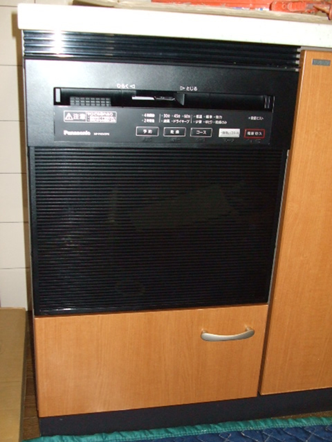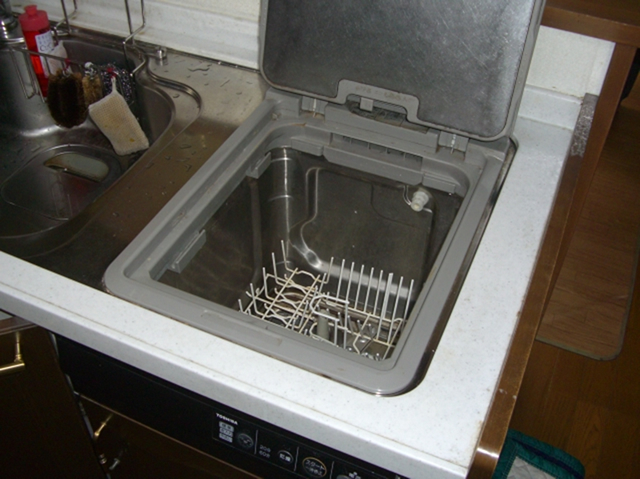 昔はやったトップオープン食洗機でした。シンクキャビネットに組み込むタイプなのでとてもスペースにムダがあり、容量も3~4人分の食器しか洗えないので新しい食洗機に取り替えです。